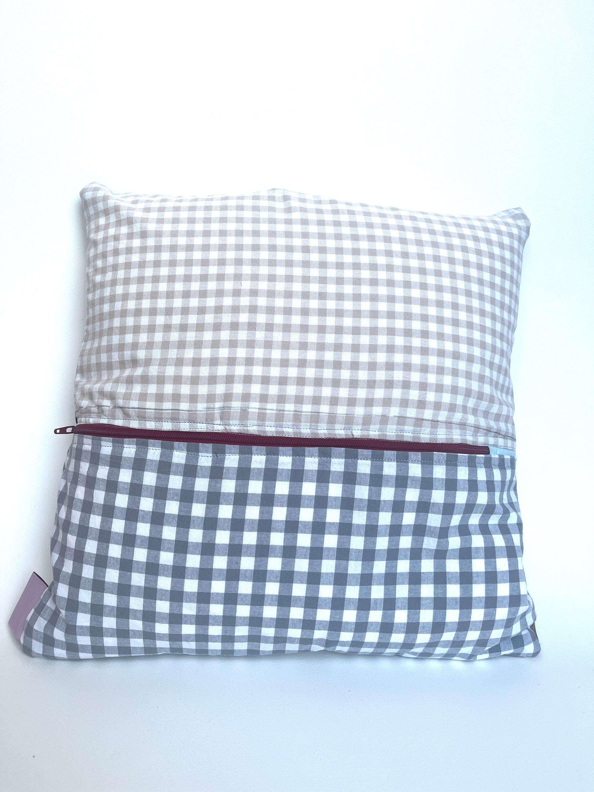 Vorderseite aus handbedrucktem Vintage Linen mit Siebdruck, Rückseite aus Vichy-Karo-Stoff.