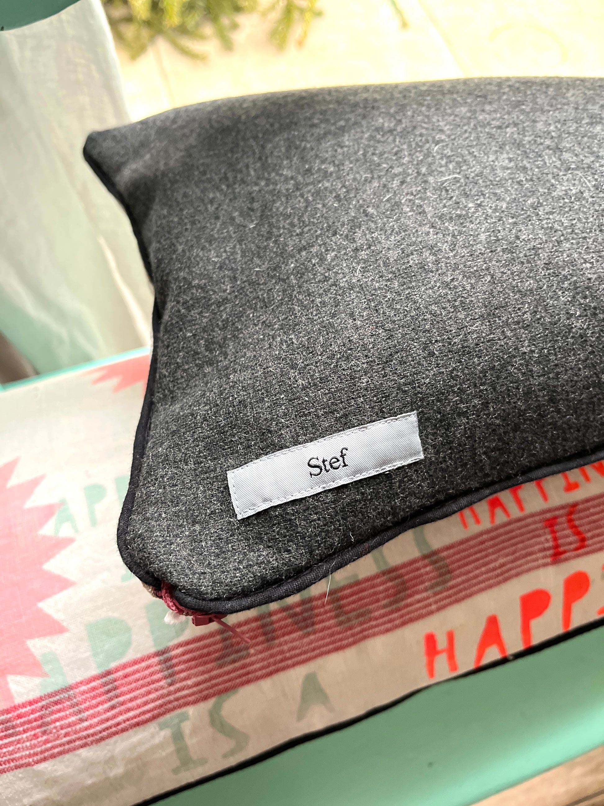 – Rückseite: dunkelgrau-schwarze Wolle mit Reißverschluss