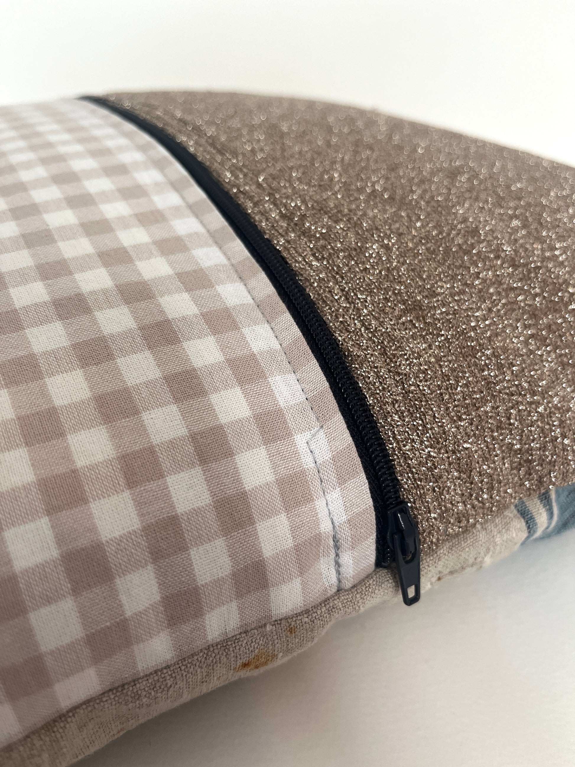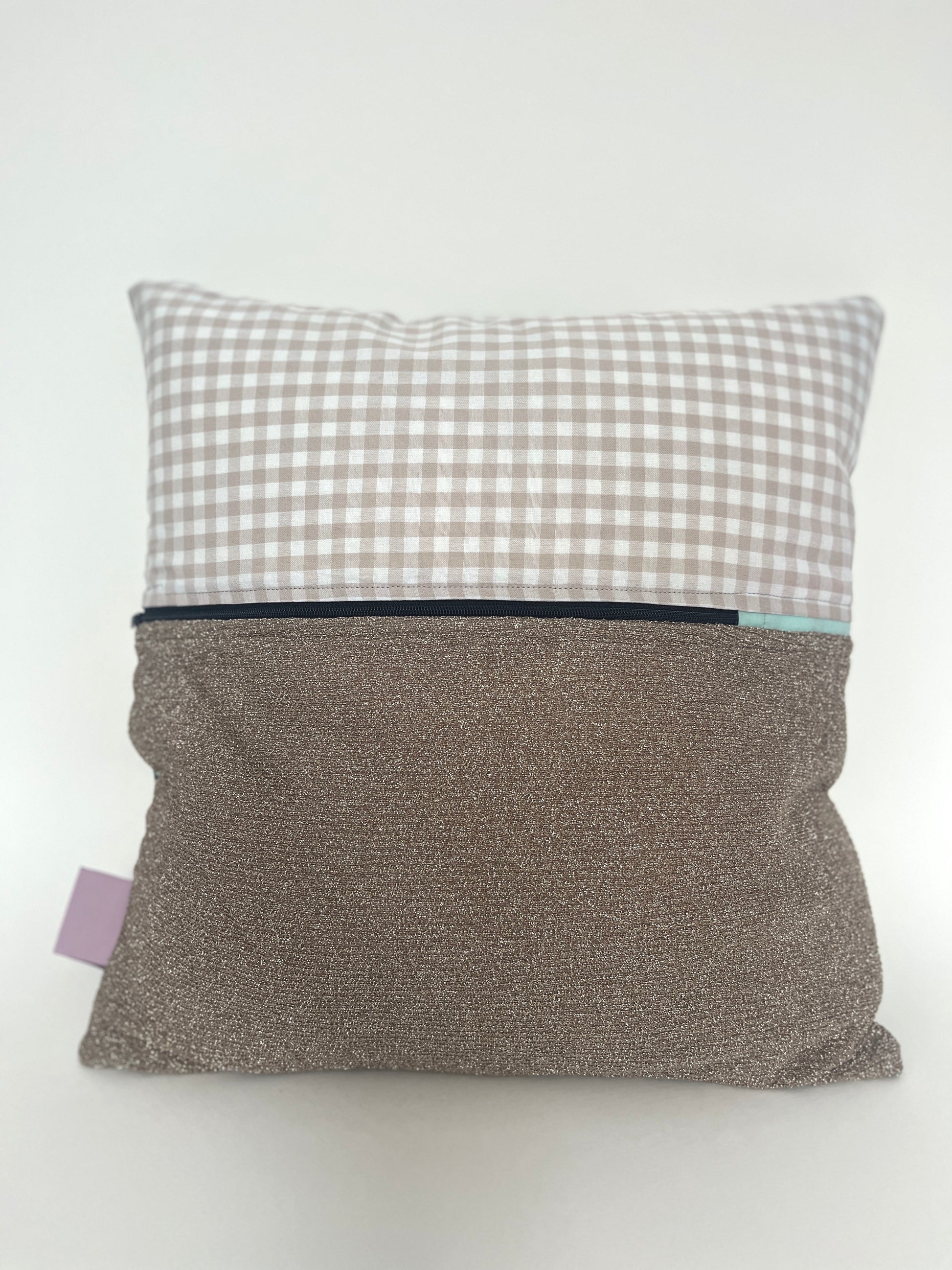 Die Vorderseite zeigt ein Boxer-Motiv in Rot, Grün, Blau und Braun. Die Rückseite ist aus kariertem Vichy-Stoff gearbeitet. Ein schwarzer Reißverschluss aus Vintage-Glitzerstoff setzt einen feinen Akzent.