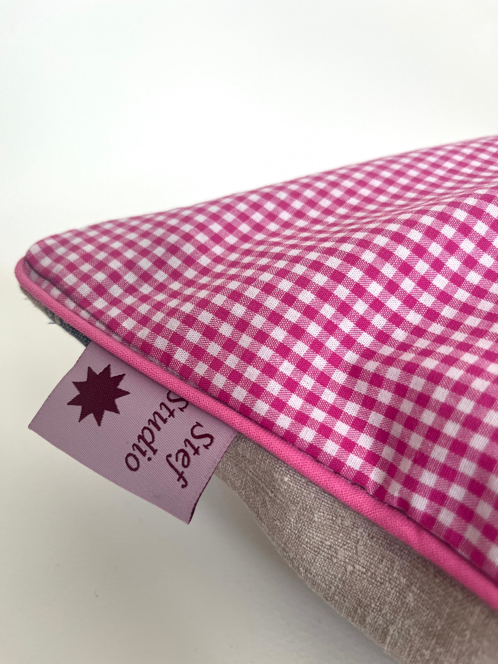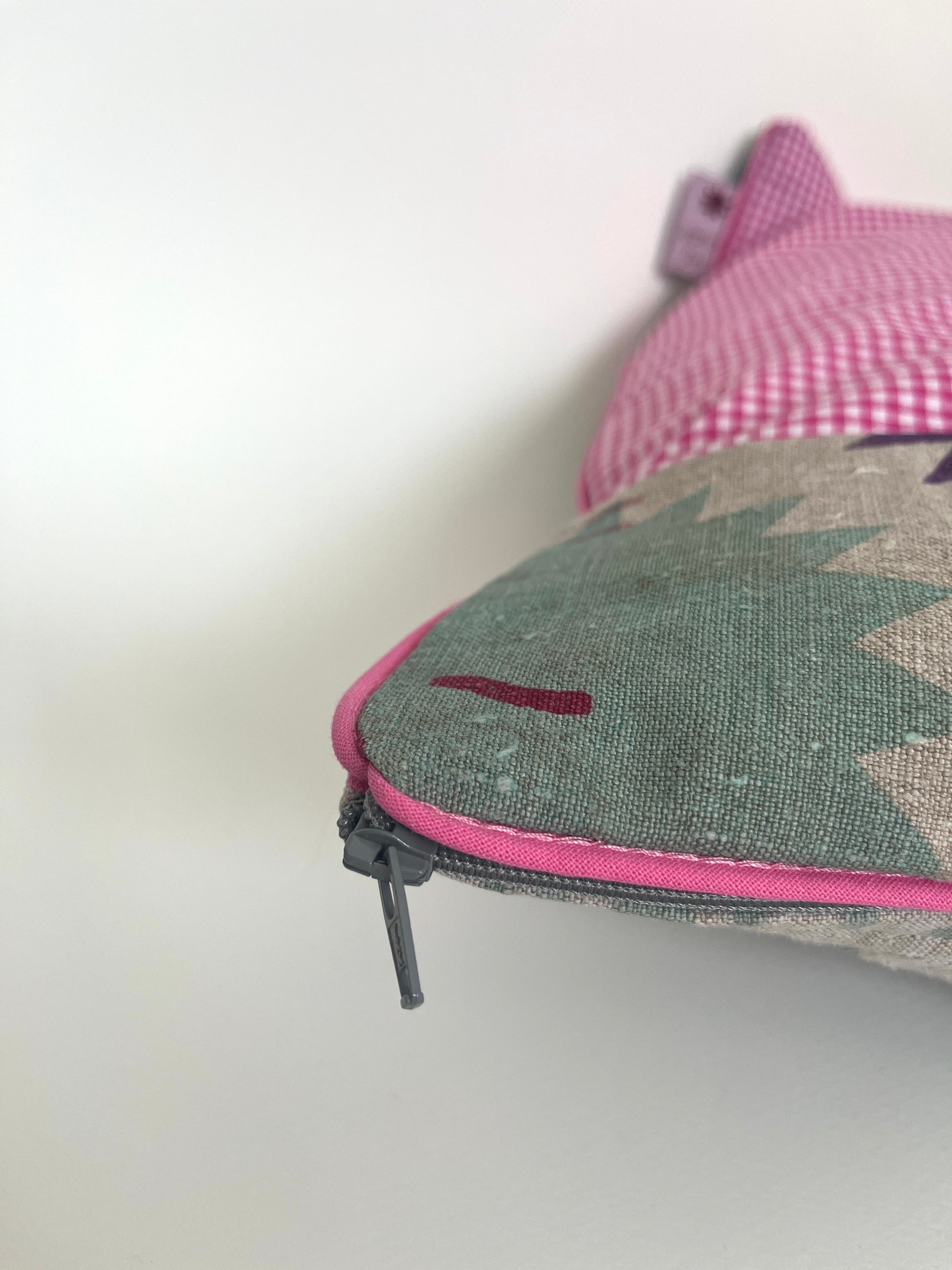 Die Rückseite ist dicht vernäht mit einem Karomuster aus Kimono-Stoff, Futon-Baumwolle und applizierten Leinenstücken. Eine rosa Pastelborte rahmt das Kissen ein, der schwarze Reißverschluss setzt einen klaren Akzent.