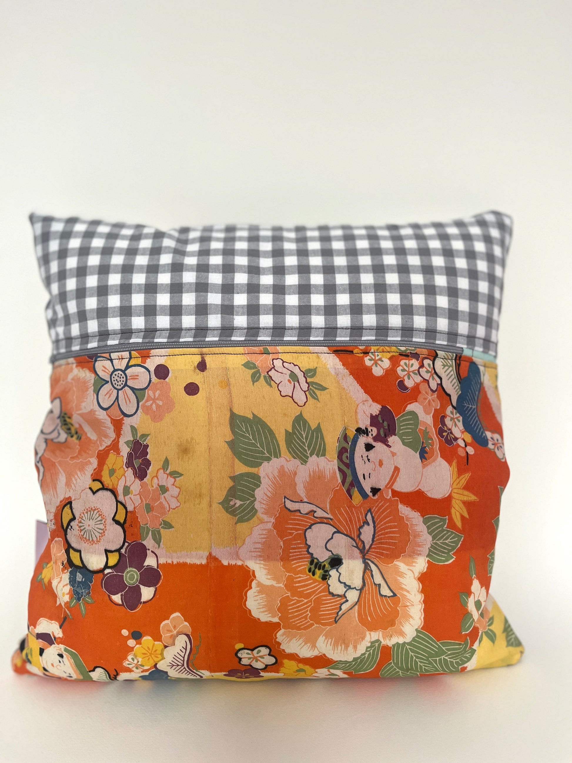 Auf der Rückseite ist originaler Vintage-Kimono-Stoff mit Vichy-Karo verarbeitet. Die Kombination aus klarer Grafik und textiler Struktur gibt dem Kissen Tiefe und Ruhe.