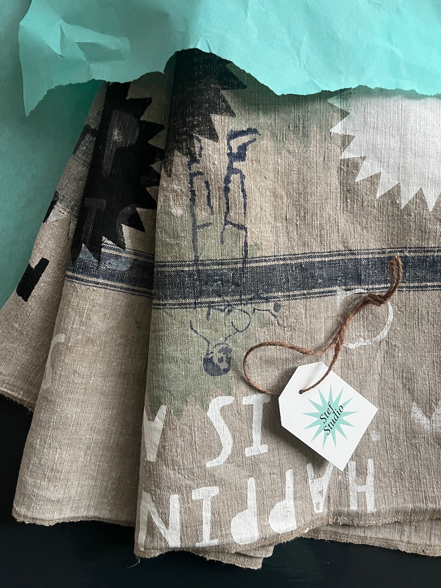 Diese handgefertigte Leinentischdecke wird aus recycelten alten Mehlsäcken gefertigt und verbindet nachhaltiges Material mit zeitlosem Design. Die natürliche Leinenstruktur bleibt sichtbar und verleiht der Tischdecke ihren charakteristischen, authentischen Ausdruck.